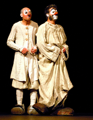 Due clown augusti, nasi rosi e scarponi (nessuno dei due voleva essere il clown bianco, quello meno comico), eppure così diversi  dal solito. Persi nel loro universo. Aspettando non Godot ma di dare un senso alla loro serata e nel farlo divertire il pubblico accorso. Una comicità poetica e allo stesso tempo esilarante creata con oggetti minimalisti come scatoloni di cartone o cancelletti di legno utilizzati insieme alle tecniche più varie del circo: giocoleria, equilibrismo, acrobazia.