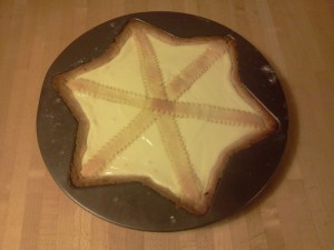 Stendere la pasta frolla (tenendone da parte un po’ per le striscioline) e metterla in uno stampo imburrato, a forma di stella. Inserire la crema. Completare con le strisce di pasta frolla. A piacere potete finire guarnendo con pasta di zucchero colorata, perline di zucchero o semplicemente con zucchero a velo.