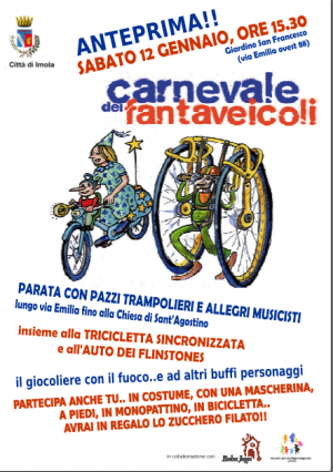 Domani a Imola si apre ufficialmente il periodo del Carnevale: le vie del centro storico si animeranno per dare il benvenuto alla sedicesima edizione del Carnevale dei Fantaveicoli in programma il prossimo 10 febbraio. Un’allegra parata organizzata in collaborazione con le Associazioni Baba Jaga e Insieme per un futuro migliore partirà alle ore 15.30 dal Giardino di San Francesco a fianco di Casa Piani: danze “ad alta quota” di trampolieri colorati, musicisti fantasiosi, performances mozzafiato di giocoleria infuocata accompagneranno due fantaveicoli della scorsa edizione che resteranno in mostra fino al 13 febbraio a fianco della Chiesa di Sant’Agostino in via Emilia est.