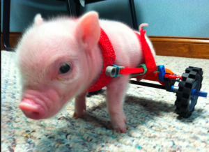 L’uomo sceglie così di portarselo a casa: usando dei giocattoli del figlio, gli costruisce una sedia a rotelle in modo che il maialino possa muoversi. Dispositivo perfezionato aggiungendo un’imbragatura e un carretto. Un’invenzione di grandissimo successo: ora il maialino pesa 10 chilogrammi , ha un suo sito personale ed è diventato un simbolo per le persone con disabilità di tutto il mondo.