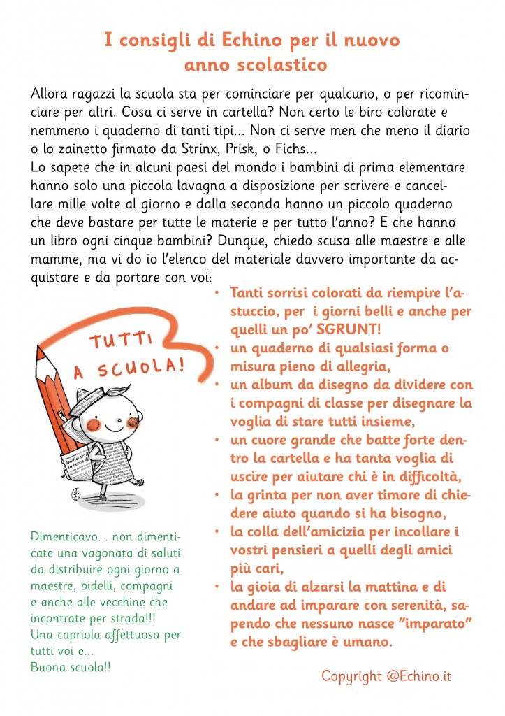 Ve la regaliamo così, integrale e originale, perché ci è piaciuta molto. Augurandovi, mamme, papà e bambini, di trovare davvero il modo per mettere un sorriso nell’astuccio. Perché questo ci piacerebbe sentire dai nostri figli, al ritorno da scuola: che bello mamma, oggi ho imparato tante cose, e ho fatto tanti sorrisi!