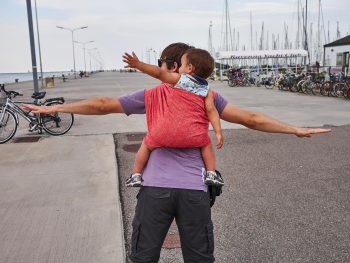 “Mio figlio piangeva, mia moglie non stava ancora bene dopo un cesareo d’urgenza. Ci avevano regalato una fascia, di quelle elastiche. Credo di averla legata anche parecchio male, leggendo solo il libretto di istruzioni. Fatto sta che Bruno, dopo pochi minuti, si è addormentato”. Si è avvicinato così, al babywearing, Lorenzo Cimatti, dottore commercialista ravennate e padre di un bimbo di 19 mesi, nonché mosca bianca nei gruppi dedicati al “portare”. Ancora oggi, quando passeggia per strada, è abituato ai commenti più disparati: “Sembri una donna africana”, “Ma è un bambino vero?” “Non sei mica un nomade”, “Sei sicuro che il bambino respiri?”. Per fortuna non mancano, qualche volta, i commenti positivi. E lui, con Bruno sulla schiena, continua a macinare chilometri, quelli che quando il figlio era neonato gli consentivano di farlo addormentare alleggerendo per un po’ la mamma. E quelli che ancora oggi gli permettono di tenere il suo piccolo “in un posto sempre accogliente”.