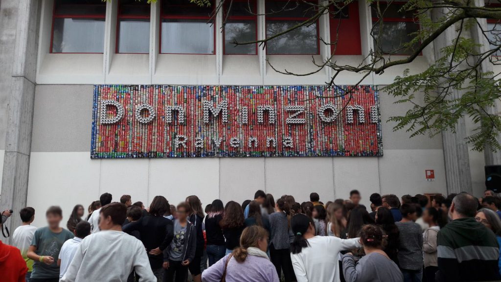 Un pannello in alluminio riciclato, di 8 metri per 2, con il nome della scuola Don Minzoni posto sulla parete della palestra. E’ il risultato di un progetto di educazione ambientale realizzato dagli studenti che hanno utilizzato 2121 lattine. Il sindaco di Ravenna e le altre autorità cittadine lo hanno inaugurato, assieme a Carla Solaini, dirigente della scuola media Don Minzoni di via Cicognani, nell’ambito della giornata inaugurale della Settimana europea della mobilità che durerà fino al 22 settembre. Altri eventi sono in programma lungo il tratto di strada di via Cicognani davanti all’edificio scolastico, che è temporaneamente chiuso alla circolazione dei veicoli a motore.