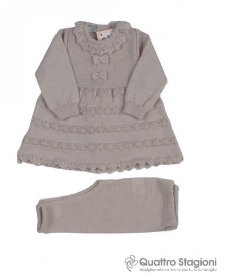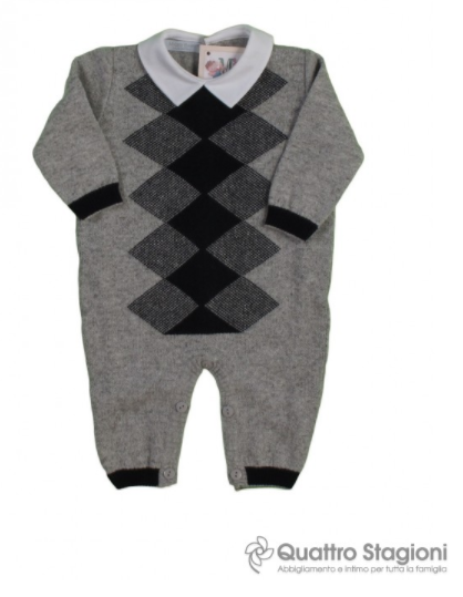 Cachemire e lana per questa tutina Micky Baby dai delicati ed eleganti colori grigio e blu.