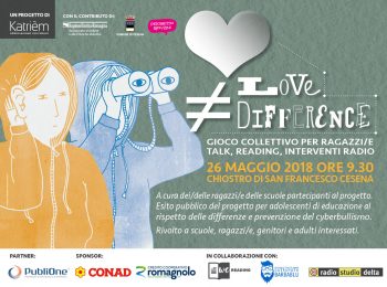 Sabato 26 maggio nel Chiostro di San Francesco a Cesena si svolgerà l’esito pubblico di Love difference – progetto di educazione al rispetto delle differenze e di prevenzione del cyberbullismo per adolescenti che ha coinvolto un centinaio di ragazzi e ragazze delle scuole secondarie di secondo grado di Cesena (Istituto Professionale di Stato Versari Macrelli, Istituto Tecnico Commerciale R. Serra e il Liceo Scientifico A. Righi) in un percorso formativo di due mesi organizzato da Katrièm Associazione. Durante il laboratorio tenuto da due psicologi (Francesco Ciuti e Fabiola Tinessa), una educatrice (Valentina Pagliarani), un’esperta di arte (Viviana Gravano) e un illustratore di giochi da tavolo (Alan D’Amico), i/le ragazz* hanno elaborato un gioco da tavolo che, sfruttando le dinamiche dello storytelling condiviso e di gruppo, mette in scena diverse situazioni legate al cyberbullismo e piùin generale al bullismo, ma al contrario anche alla ricchezza prodotta dalla valorizzazione delle differenze.