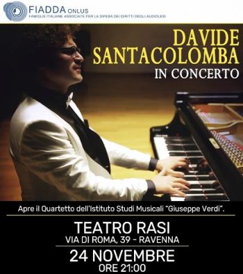 Dopo il grande successo ottenuto con forte apprezzamento di critica e pubblico a Roma (Teatro Tor Bella Monaca) il 21 maggio 2017 e a Modica (Auditorium Floridia) il 6 gennaio 2018, il pianista Davide Santacolomba torna per un nuovo appuntamento con la FIADDA Onlus, esibendosi a Ravenna, sabato 24 novembre alle ore 21:00 al Teatro Rasi, con il patrocinio della Regione Emilia Romagna, della Provincia e del Comune di Ravenna e con la collaborazione dell’Istituto Superiore degli Studi Musicali G. Verdi.
