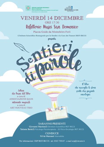 Un incontro per ascoltare le esperienze e le riflessioni di chi ha affrontato un percorso oncologico e ha voluto raccontarlo attraverso le pagine di un libro. Venerdì 14 dicembre alle ore 17:30, al Refettorio dei Musei San Domenico di Forlì, l’Istituto Tumori della Romagna (IRST) IRCCS in collaborazione con Romagna Terra del Buon Vivere – Settimana del Buon Vivere, presenta la seconda edizione di “Sentieri di Parole”.