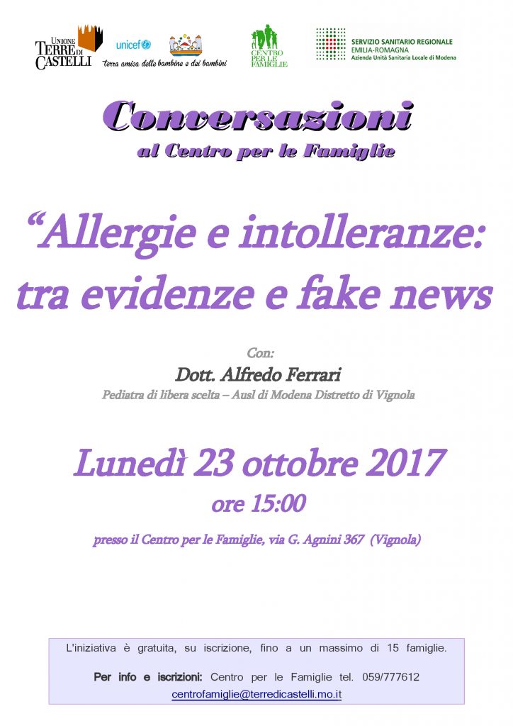 “Allergie e intolleranze alimentari”: 23 ottobre ore 15 a cura del  dott. Alfredo Ferrari pediatra di libera scelta. Entrambe le iniziative sono ad accesso libero e gratuito, su iscrizione e si svolgono presso il Centro per le Famiglie in via Agnini 367. Per info e iscrizioni: 059/777612 centrofamiglie@terredicastelli.mo.it