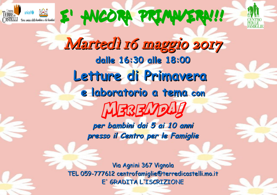 16 maggio dalle 16:30 alle 18:00 presso il Centro per le Famiglie, via Agnini 367.