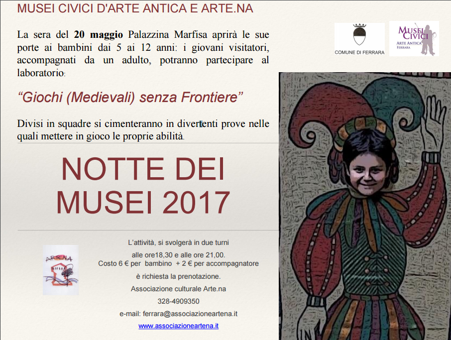 Sabato 20 maggio, alle 18.30 e alle 21 a Palazzina Marfisa di C.so Giovecca 170, in occasione dell’iniziativa nazionale “La Notte dei Musei 2017″, i Musei Civici di Arte Antica, in collaborazione con l’associazione Arte.Na, invitano tutti i bambini e le loro famiglie a partecipare al laboratorio didattico “Giochi (Medievali) senza frontiere”. E’ richiesta la prenotazione.