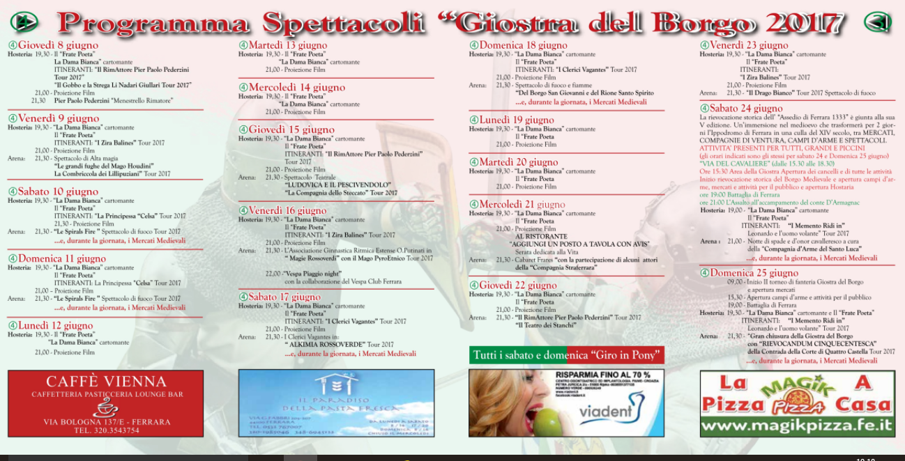 Fino a domenica 25 giugno, presso l’Ippodromo Comunale di Ferrara si tiene la XIII Edizione de “La Giostra del Borgo”. Grandi e piccini sono invitati a fare un tuffo nel Medioevo partecipando alla rievocazione storica di una cittadina medievale in cui sarà possibile assistere a duelli all’arma bianca, al tiro con l’arco in cui si cimenteranno arcieri in costume dell’epoca e si potranno osservare gli antichi mestieri.