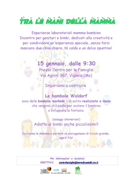 Tra le mani della mamma (laboratorio mamma bambino) 15 gennaio ore 9:30 presso Centro per le Famiglie via Agnini 367 Vignola realizzeremo il “Le bambole Waldorf”.