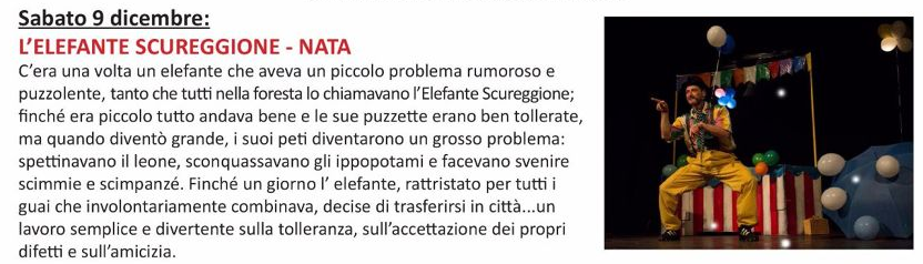 Domenica 9 dicembre parte la rassegna “Il granaio dei sogni” con “L’Elefante Scureggione” di e con Livio Valenti alle ore 16:00, a fine spettacolo una NOVITÀ per i più golosi: merenda per tutti con l’associazione “La Casa Matta”!