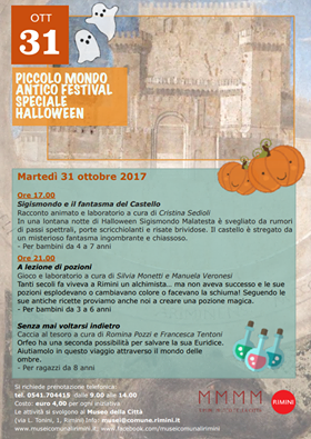 Torna, fra le attività proposte dai Musei Comunali di Rimini nell’ambito delle iniziative Mese delle Famiglie organizzate dal Comune di Rimini Piccolo mondo antico festival. Speciale Halloween. Nella serata di sabato 31 ottobre il Museo della Città si animerà di racconti, visite plurisensoriali, avvincenti cacce al tesoro e performace teatrali pensate per avvicinare bambini, ragazzi e adulti alla tradizione del cibo (tema dell’edizione 2015)  e ai rituali delle offerte ai defunti.