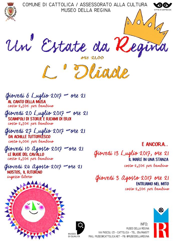 Sulla scia dell’intensa attività didattica che il Museo della Regina mette in campo durante l’intero anno scolastico, anche questa Estate si andranno a sperimentare gli aspetti più propriamente ludici della didattica museale in attività serali per bambini, ragazzi e adulti: dal 6 luglio al 24 agosto, il giovedì sera alle 21,00 nel giardino e nelle sale del Museo si incontreranno bambini, genitori, nonni, zii e chiunque vorrà unirsi a noi per il racconto di uno dei grandi poemi greci: l’Iliade, appunto e di alcuni dei suoi libri: il primo, il terzo, l’ottavo, il nono, il dodicesimo.
