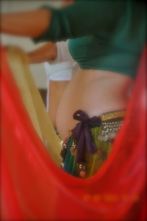 “La danza in grembo, è una danza del ventre adatta alle donne gravide, che si basa sul metodo Shamsa-ra, promotore del movimento in gravidanza. E’ un metodo di insegnamento con progressione didattica che conduce la gestante ad un allenamento dolce per facilitare il cambiamento del corpo in favore del parto. L’incontro comincia con un riscaldamento e uno stretching delicati. Poi si passa ai movimenti dolci della danza del ventre che apportano vari benefici alla donna. Predispongono a un’apertura del bacino, migliorando successivamente il momento del travaglio e rendendolo meno doloroso. Creano una sorta di ritmo attraverso la respirazione, portando il ‘focus’ della gestante dentro di sè e instaurando così un ponte di collegamento tra madre e bambino. Inoltre durante la lezione vengono create delle coreografie centrate sul basso ventre che rappresentano un massaggio per il bambino, che viene cullato proprio dal movimento. Questi movimenti vanno anche a migliorare la circolazione sanguigna, la digestione e il sistema urinario. Verso la fine della lezione si procede con degli esercizi per il pavimento pelvico. Inoltre, a seconda delle situazioni e delle attitudini delle persone in sala, si può praticare una piccola meditazione, una tecnica di rilassamento che dura alcuni minuti”.