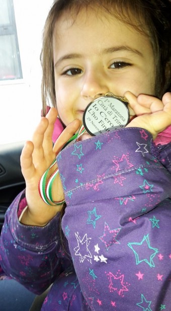 Non saprei nemmeno riconoscere quel papà e la sua bambina. Forse è per questo che mi sarà facile portarli nel cuore per molto tempo. Non sarà l’unico ricordo della giornata. Ora sto contando i passi e un poco me la prendo con me stesso, perché vorrei andare più veloce ma non ci riesco, perché sono all’ultimo km ma l’arco dell’arrivo tarda ad entrare nel mio orizzonte ottico. Così mi dico conta ancora fino a cento e poi, solo poi, potrai alzare di nuovo il capo. Arrivo a novanta e sento uno che grida, e grida forte perché sarà trecento metri avanti a me: VAIIIIICRIIIIII!!!!! E’ Gaetano, l’amico che chiunque vorrebbe, che mi ha aspettato al traguardo, guardando il cronometro ogni cinque secondi negli ultimi minuti ed ogni volta masticando tra sé MA PERCHE’ NON ARRIVA. Vedermi lì in fondo, per lui, è stata la fine del suo soffrire, in qualche modo, lui stava correndo con me. Con lui c’è Silvio, anche lui padre, podista, amico. Ci abbracciamo subito dopo il traguardo, e lo stringo forte, perché sentirsi accolti da chi ti vuole bene dopo una dura giornata è meraviglioso. Dopo una maratona, di più”.