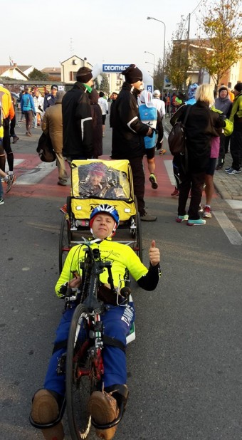Il protagonista è Umberto Pascoli, 49 anni, quasi la metà dei quali passati in sedia a rotelle in seguito a un incidente. A Marina Romea, dove vive, ha iniziato diverso tempo fa ad appassionarsi all’hand-bike. E in questa avventura, ha coinvolto da subito sua figlia Andrea Celeste, sei anni. Una bambina abituata ad essere caricata sul carretto attaccato alla bici quando papà gareggia.