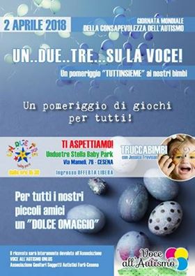 In occasione della Giornata mondiale della consapevolezza dell’autismo, l’associazione Voce all’Autismo organizza “Un…due…tre…sulla voce!”, un pomeriggio di giochi per tutti. L’ingresso è a offerta libera. Per tutti i bambini ci sarà un dolce omaggio.