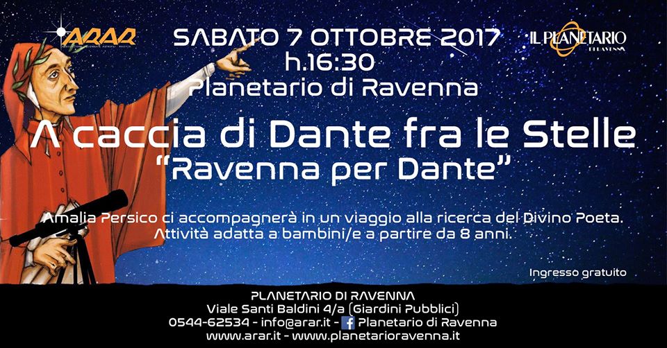 Anche quest’anno il Planetario di Ravenna, in collaborazione con l’Arar (Associazione ravennate astrofili Rheyta), partecipa all’evento “Ravenna per Dante”, rendendo omaggio alla vita e alle opere di Dante Alighieri all’insegna del celebre verso “Uscimmo a riveder le stelle” con cui si conclude la prima cantica della Divina Commedia.
