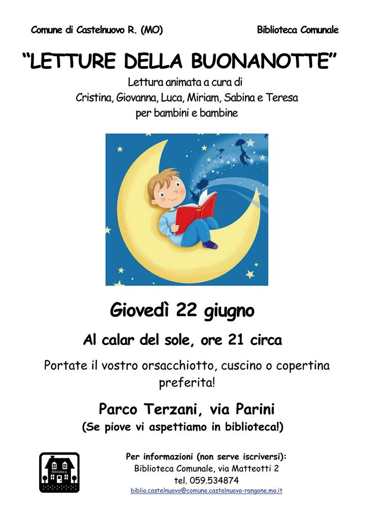 Giovedì 22 giugno al calar del sole presso il Parco Terzani “Letture della buonanotte” organizzate dalla Biblioteca di Castelnuovo.