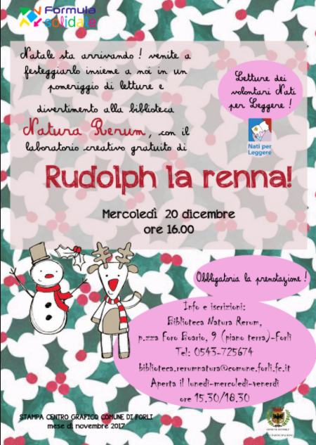 Mercoledì 20 dicembre – ore 16.00 – “Rudolph la renna”. Laboratorio natalizio, preceduti da letture animate del gruppo Lettori e Musicanti Volontari, progetti NpL e NpM. A cura di Formula Solidale Cooperativa Sociale Onlus. Dai 4 ai 10 anni