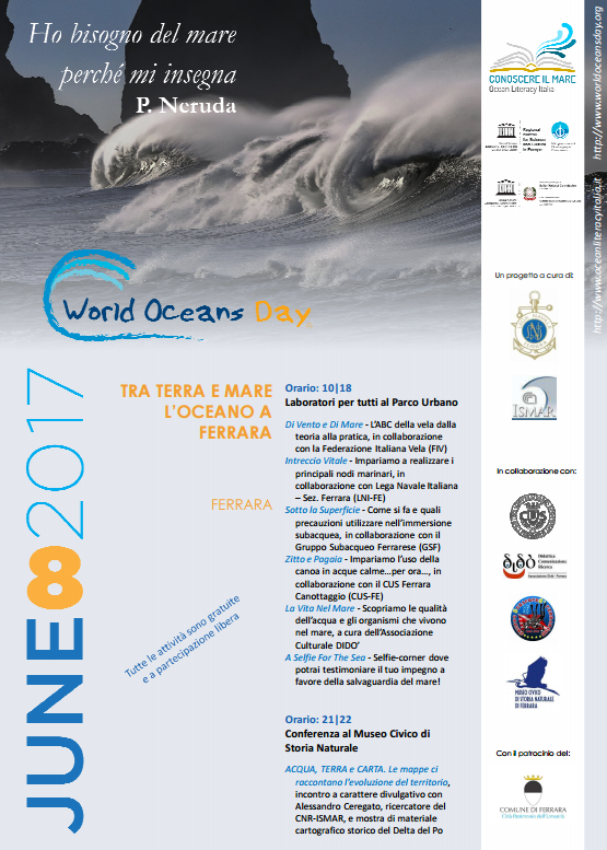 Giovedì 8 giugno si celebra la Giornata Mondiale dell’Oceano (World Oceans Day – WOD). La Lega Navale Italiana – Sede di Ferrara (LNI) e l’Istituto di Scienze Marine di Bologna del Consiglio Nazionale delle Ricerche (CNR- Ismar) in collaborazione con Centro Universitario Sportivo (CUS), Associazione Didò, Centro Subacqueo Ferrarese e Museo di Storia Naturale, invitano grandi e piccini a partecipare a tanti laboratori diversi che avranno come tema l’acqua e che si svolgeranno dalle 10 alle 18 al Parco Urbano.